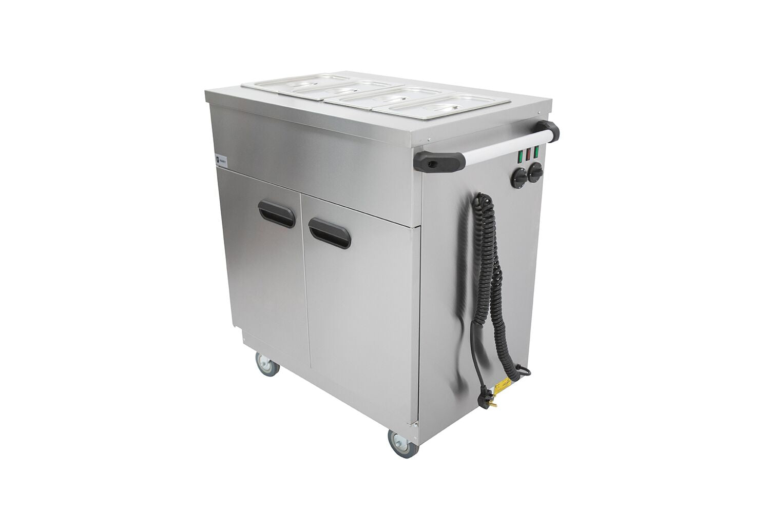 1894 Mobile Servery – Stainless Steel Hot Cupboard & Bain Marie Cart with 4 GN Pans, Removable Shelves, Castors, 20-Plated Meal Capacity